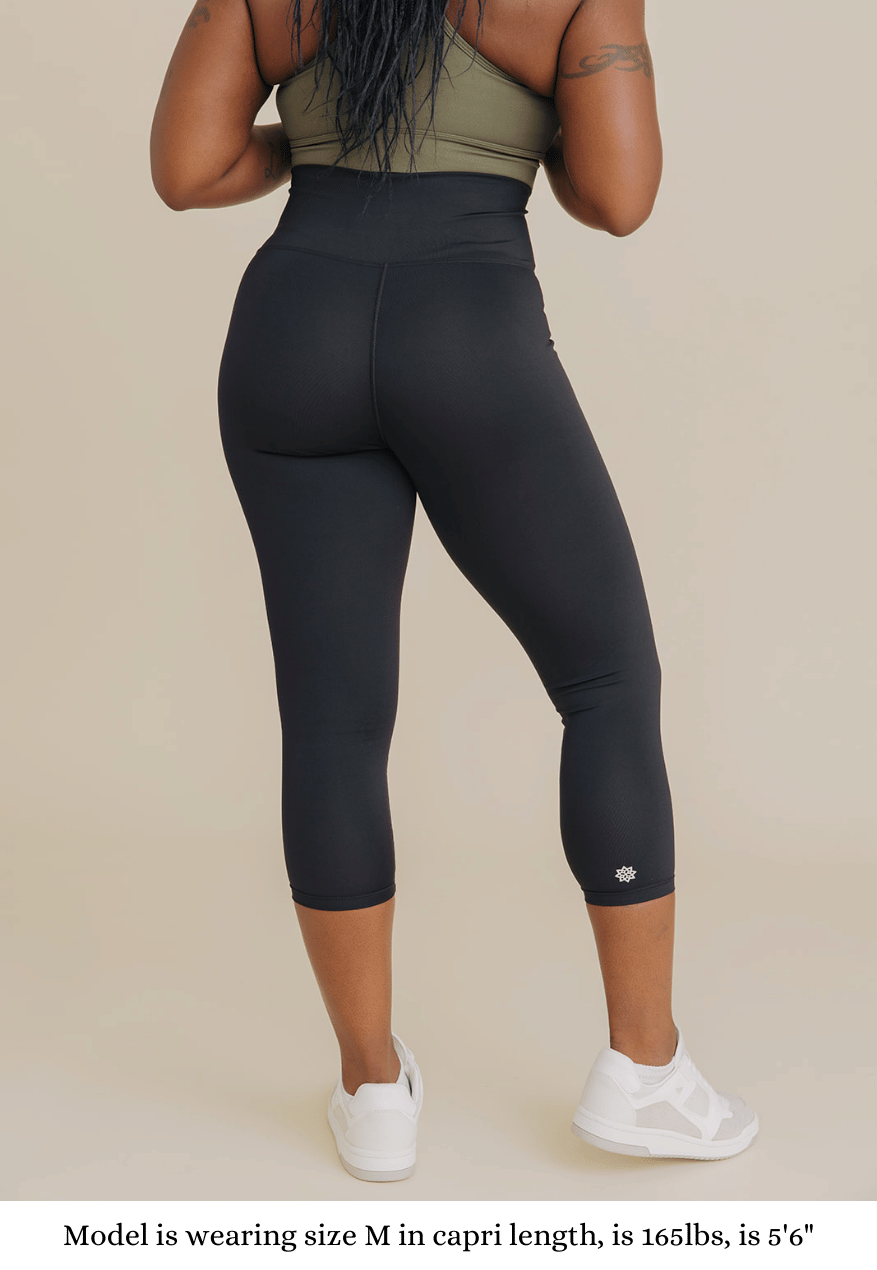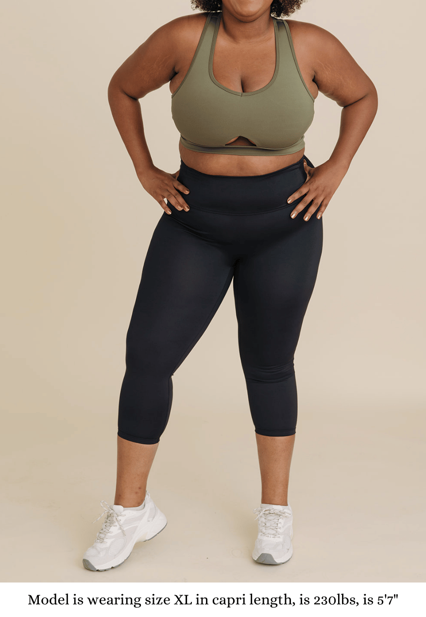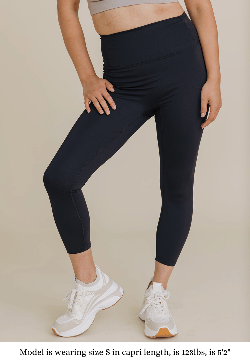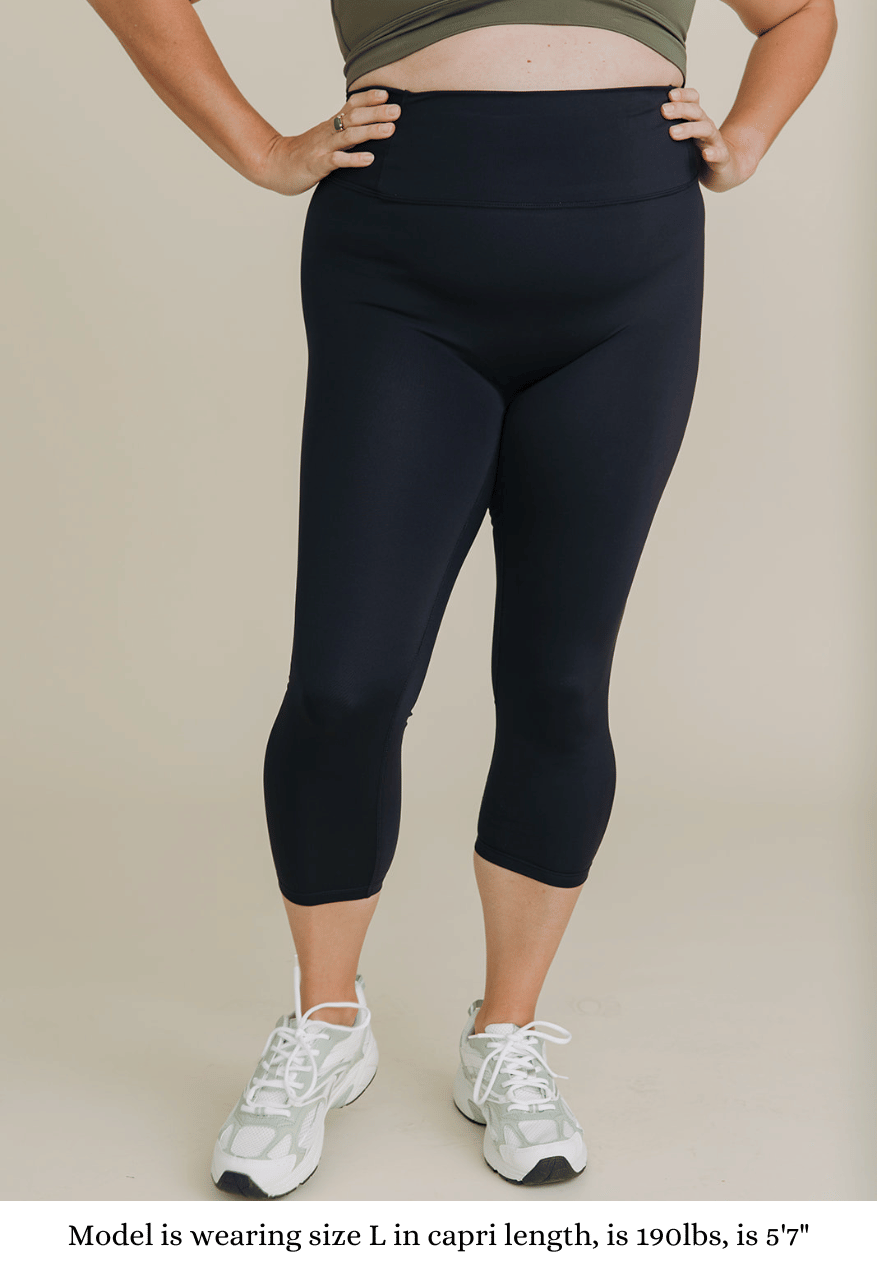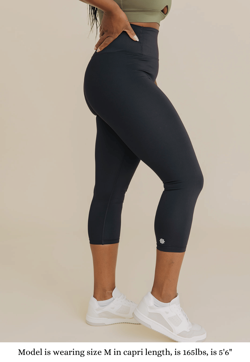 Same features that we love in our Anytime Legging- a high waist band with compressive 4-way stretch fabric, squat proof and no front seam, just in capri length.